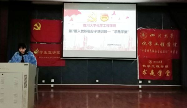 2020年11月29日上午9:30在江安校区第二基础教学楼B座报告厅,成功举办了四川大学化学工程学院第七期入党积极分子培训班——“求是学堂”的小组展示活动。此次活动由四川大学化学工程学院党建指导教师李珍珍主持,ppt小组展示分享的主题包括:“党的百年征程”、“疫情中的共产党员们”、“新时代中新青年的新担当”、“忆苦思甜,我谈抗美援朝精神”、“不忘初心跟党走,脱贫致富奔小康”5个主题。此次活动的目的是进一步促进积极分子内心对党的向往,也使其更加清楚党员的内涵,贯彻和落实社会主义核心价值观,传播正能量,为中国特色社会主义建设做出自己的贡献。