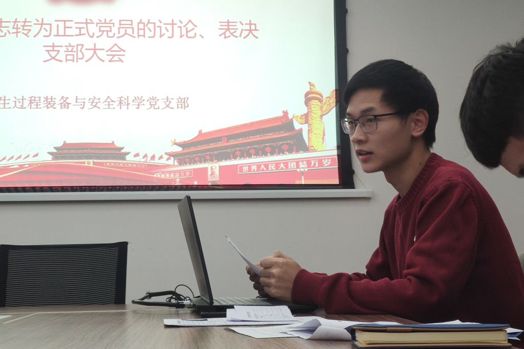 2021年11月25日,研究生过程装备与安全科学党支部就将刘欣同志转为正式党员的支部大会在我校化工楼227会议室开展。本次支部大会由支部书记邓松同志主持。