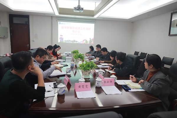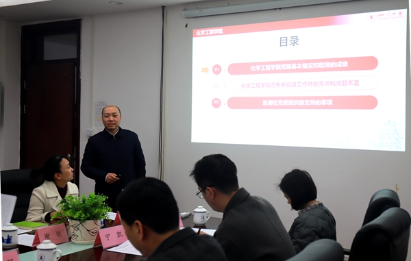 学院党委书记李天友向黄园常务副部长一行汇报了学院党建工作情况。他说到,化学工程学院党委在学校党委坚强领导下,在党委组织部有力指导下,深入学习贯彻习近平新时代中国特色社会主义思想和党的十九大及十九届历次全会精神,坚持以党的政治建设为统领,团结带领学院全体师生做到“爱党爱国、立德树人、敢为人先、攻坚克难、发展至上”,做好把方向、定政策、促改革、抓发展、保落实有关工作,有力推进党建与事业融合发展,学院党建和一流学科建设取得可喜成绩。李天友重点介绍了学院党建“1347”的特色做法。对于今年的党建工作,李天友说到,学院全体师生将深入学习贯彻习近平新时代中国特色社会主义思想和党的十九届六中全会精神,做“两个确立”的坚决拥护者和“两个维护”的坚定践行者,把方向、强学习、紧联系、保落实,坚定务实作风,大力解决影响发展的主要矛盾和矛盾的主要方面,聚焦立德树人根本任务,对标学校“三高”目标,切实提升办学水平,努力建设一流化工学科。