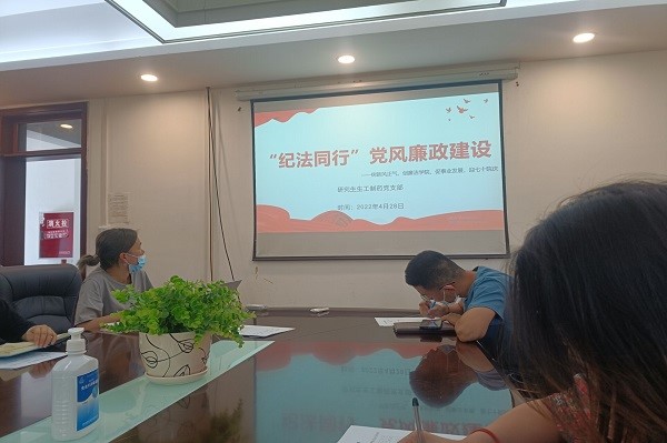 2022年4月28日,化学工程学院研究生生工制药党支部于望江校区化工楼235会议室举行了党课学习活动,学习内容主要为“‘纪法同行’党风廉政教育”,本次活动邀请了孙初锋院长参会,会议由党支部书记吴玟仪同志主持。