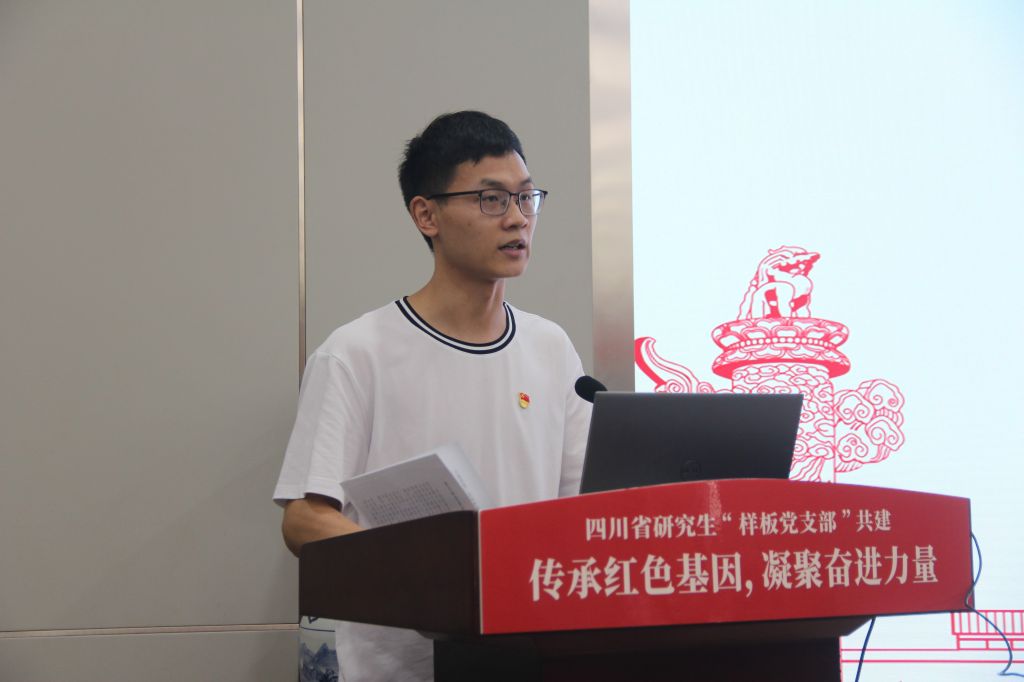 活动第二项,四个“样板党支部”分别以《突出“高度、力度、精度和深度”,建立“四有制度+”工科新型党组织》、《师生混编党支部“蝴蝶”效应促研究生培养》、《白衣秉丹心,银针传岐黄》、《科技强国勇担当,同心向党续华章》 为题,分享了支部创建经验。其中,四川大学化学工程学院研究生过程装备与安全科学党支部书记邓松从“有政治高度,强化理论学习、有凝聚力度,突出品牌特色、有服务精度,瞄准群众所需、有育人深度,实现自我发展”四个方面进行了分享。
