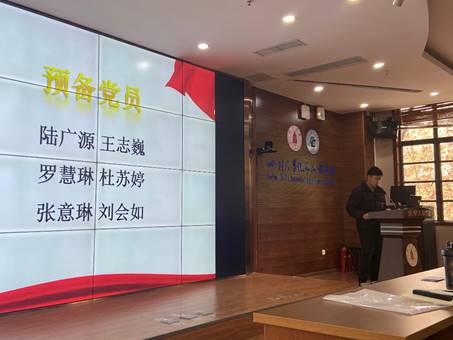 会议第二项议程紧随其后展开,由陆广源、王志巍、罗慧琳、杜苏婷、张意琳、刘会如六位预备党员依次进行发言。六位同志从考察期过程中自身的不足与成长出发,结合一年中的经历,表达了自己不断加强理论学习、努力与党组织靠拢的决心与恒心。同时,入党介绍人通过对预备党员一年的观察,客观公正地对其能否转为正式党员表达了看法,他们一致认为六位预备党员在考察期内能够主动学习党史,关注时事政治,为人正派且严谨求实,同意其按时转正。最后,经与会党员无记名投票,预备党员陆广源等六名同志转为中共正式党员。