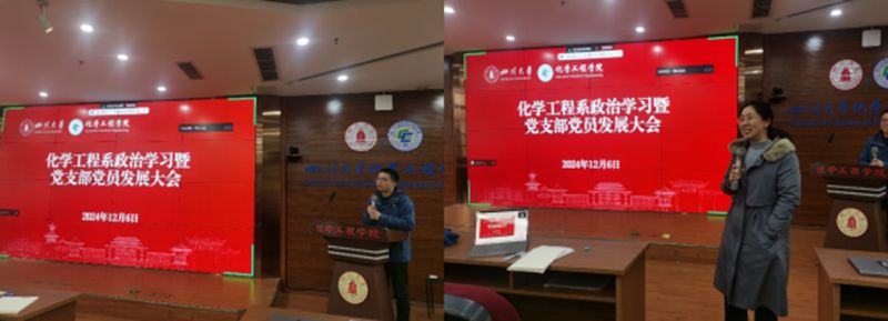 2024年12月6日下午,四川大学化学工程系党支部开展了组织生活与推荐确定入党积极分子大会。会议由汪伟老师主持,化学工程系全体党员同志参加。会议伊始,汪伟老师对近期支部党员发展工作进行了介绍,并就李红娇、邹宗鹏两位入党积极分子候选人的具体情况进行了详细介绍。在会议上,谢锐、唐思扬、吉俊懿等化工系党支部多位党员教师对两位入党积极分子候选人的情况进行了讨论和评议,充分肯定了两位候选人在思想政治、教书育人及社会服务等诸多方面的良好表现。通过民主推荐和评议,两位候选人被接受确定为入党积极分子。