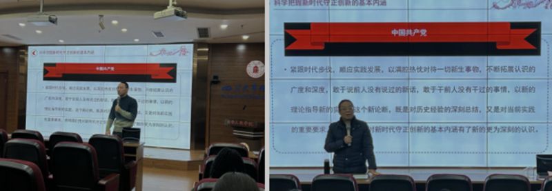 在会议第一部分,各党支部党员代表展开主题领学。研究生磷化工党支部乔鲜艳强调入党需高标准严要求,党员要以英雄精神推动事业发展;分离科学党支部郑卓超分享学习《必须坚持守正创新》文章精神,倡导坚守正道并创新;第一党支部马东旭介绍宪法意义并领誓;第四党支部冉袁静围绕弘扬宪法精神谈全面深化改革;第六党支部唐毅苗从历史角度解读守正创新;工科化学基地党支部邓怡分享学习《以人口高质量发展支撑中国式现代化》文章精神,号召党员响应人口发展举措。