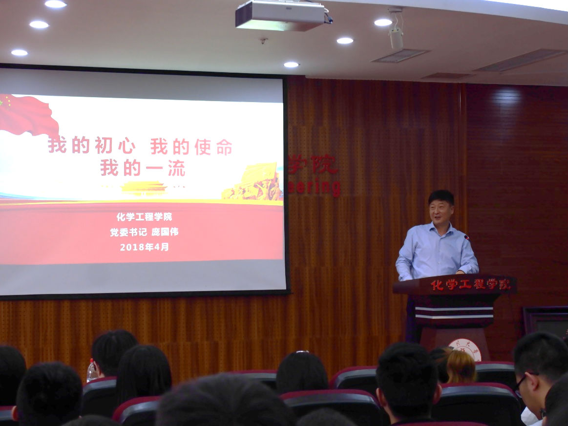 三是巩固活动效果,为师生主讲廉政党课。为了教育引导单位干部职工坚定共产党人初心和使命,始终把握正确育人方向,4月28日下午,化学工程学院党委书记庞国伟同志为学院师生以“我的初心、我的使命、我的一流”为题主讲廉政党课。庞书记从一个历史使命与“四个伟大”、一个重大思想:新时代中国特色社会主义思想、两个重要时期、两个阶段(“两步走”)、川大人的初心和使命和齐心协力,共创一流五个方面对“为中国人民谋幸福,为中华民族谋复兴”这个初心和使命进行了详细解读,并要求全体师生以永不懈怠的精神状态和一往无前的奋斗姿态,继续朝着实现中华民族伟大复兴的宏伟目标奋勇前进。
