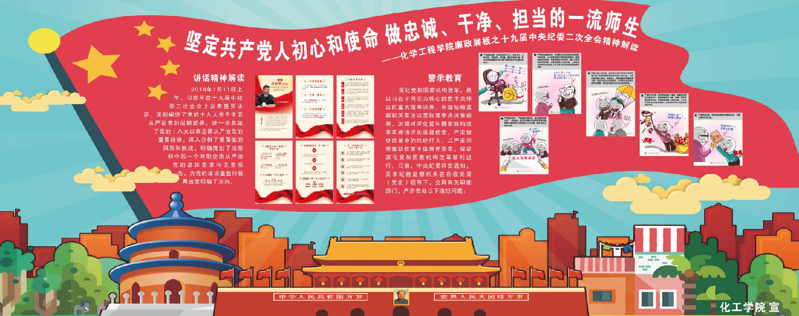 以党风廉政教育“坚定共产党人初心和使命,做忠诚、干净、担当的一流师生”为主题在望江校区化工学院门口设立宣传栏,专栏内容对习近平在十九届中纪委二次会议上的讲话精神进行了全面解读,并采取漫画形式对党员违规违纪开展警示教育,宣传领会与警示教育相结合,强化纪律意识和廉政观念。