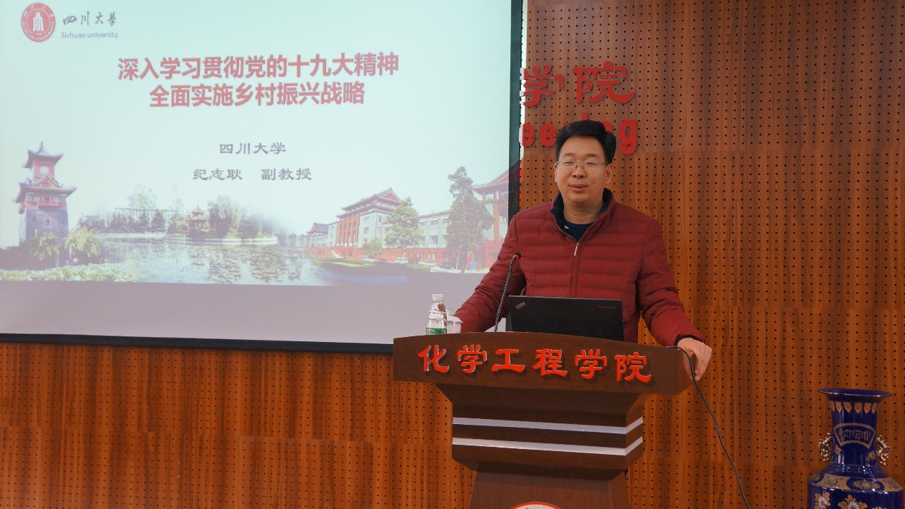 12月21日下午,化学工程学院特邀学校“学习贯彻党的十九大精神宣讲团”成员、四川大学党委宣传部副部长纪志耿副教授在望江校区化工楼313报告厅举行党的十九大精神宣讲报告会。化学工程学院党政领导班子、全院教职工、离退休老同志和部分学生代表等180余人参加了此次宣讲报告会。
