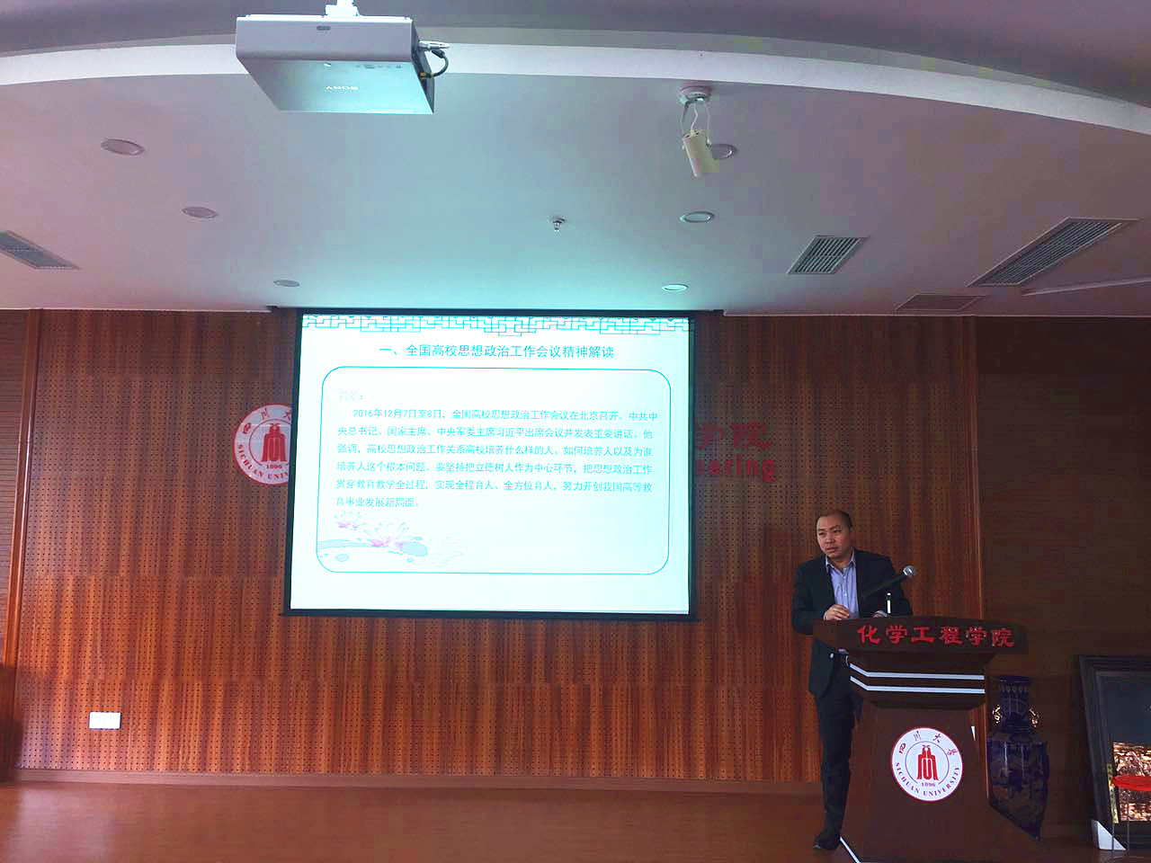 会上,支部成员、学院党委副书记李天友分享了自己对全国高校思想政治工作会议精神的心得体会。李天友同志说到,习近平总书记的重要讲话,站在战略和全局的高度,深刻回答了事关我国高等教育事业发展的一系列重大问题,具有很强的战略性、政治性、思想性和针对性,具有重大而深远的意义。通过贯彻习近平总书记重要讲话精神,我们应该深刻认识做好高校思想政治工作的重大意义即解决和落实好高等教育“培养什么样的人、如何培养人以及为谁培养人”这一根本问题。在结合自己的理解分析了本次会议精神后,李天友同志说到,作为四川大学教职工党员,我们应该始终坚持以马克思主义为指导,坚持党对高校的领导,坚持把“立德树人”作为中心环节,坚持弘扬社会主义核心价值观,牢牢把握社会主义办学方向,培养中国特色社会主义合格建设者和可靠接班人,为四川大学实现“双一流建设”而努力。