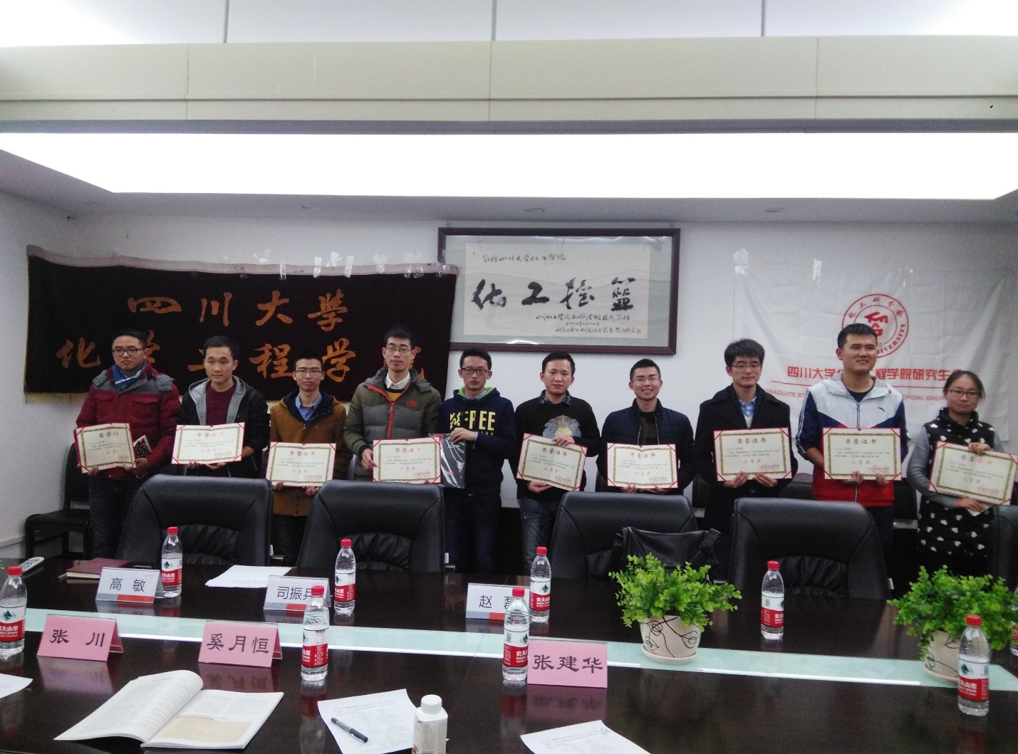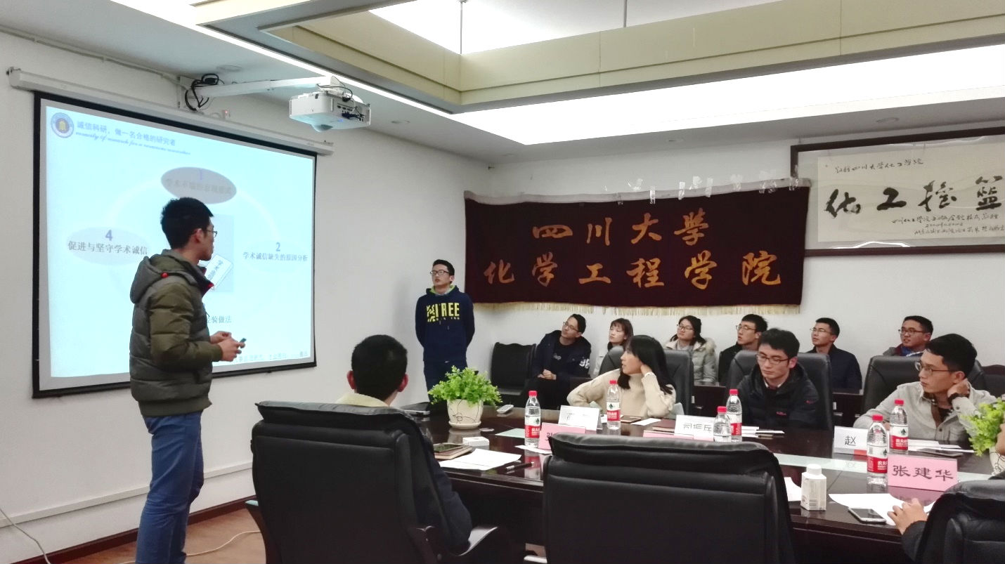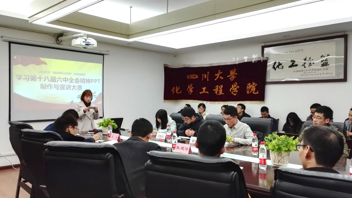 2016年11月23日19点,四川大学“诚信教育宣传月”系列活动之学习第十八届六中全会精神PPT制作与宣讲大赛在化工楼235顺利举行,本次活动由化学工程学院研究生分会主办。参加这次PPT大赛的全部为来自化学工程学院的全部14个研究生党支部。化学工程学院思政辅导员司振兵老师、化学工程学院党政办公室高敏老师、化学工程学院兼职辅导员赵磊学长、化学工程学院研究生会主席张川、奚月恒、张建华学长出席了本次活动,并担任评委嘉宾。活动由2016级应化专业研究生徐双凤主持。