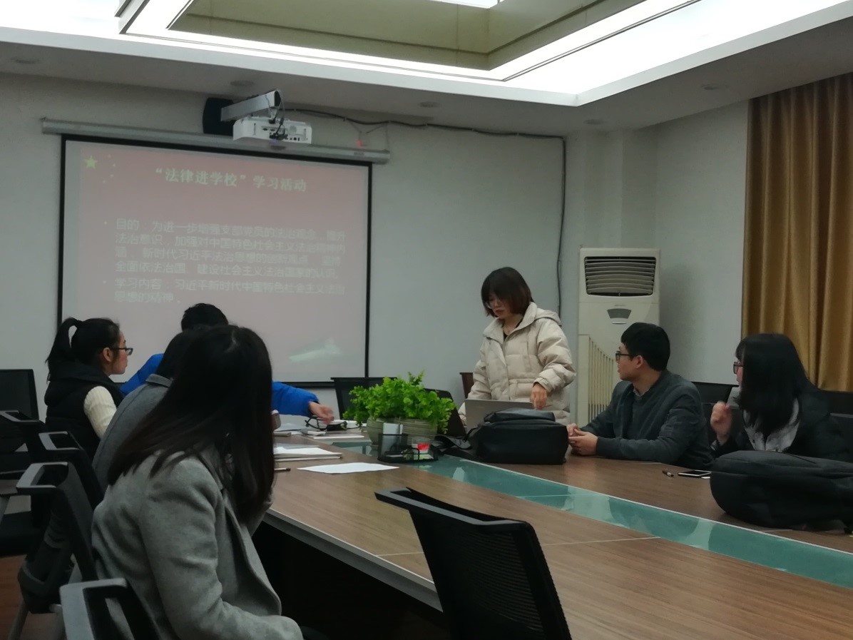 在会议正式开始前,组织委员许驰同志确认到场人数,此次党支部大会支部成员应到22人,实到20人。大会分为两部分,首先由支部书记李鑫燚同志讲解了关于“法律进学校”及《榜样3》学习的PPT,讲解内容分为两大部分。第一部分学习内容是“法律进学校”相关学习内容,包括“坚持党的领导、走中国特色社会主义法治道路”等三个主题。第二部分学习内容是《榜样3》的学习内容,包括宋书声、国测一大队等八个集体和个人的先进事迹。学习内容完成后,支部成员进行了积极地讨论。纷纷表示要向优秀的党员同志学习,不辜负党的培养。