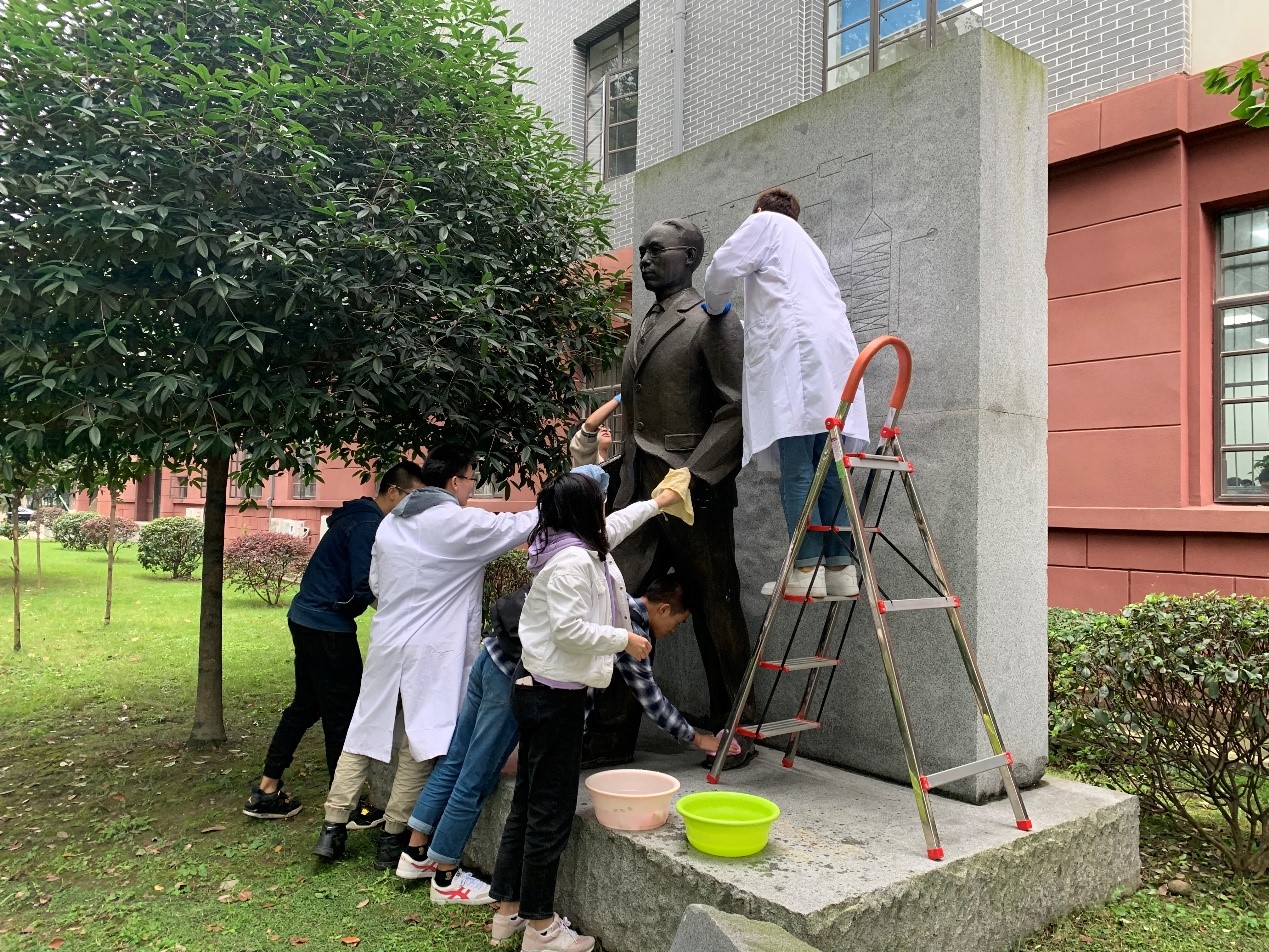 2019年10月15日15:00,膜科学第二党支部部分党员同志前往化工楼前打扫清洁张洪沅老先生的雕像。张洪沅老先生是我国著名的化工学者、教育家,他是我国化学工程教育的奠基人之一。在对张洪沅老先生的雕像进行认真的清理之后,支部书记李新娇同志带领参与活动的党员对张洪沅老先生的生平进行了详细的了解,同时学习了老先生的“刻苦学习,振兴中华乃我辈己任”的精神。