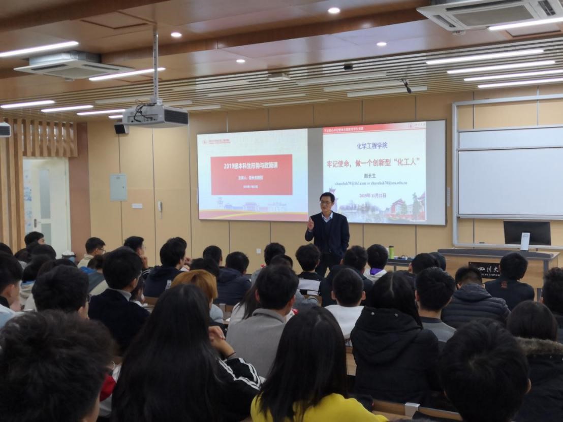 11月22日下午14:00,在江安河畔的综合楼C206教室,结合“不忘初心,牢记使命”主题教育,化学工程学院院长赵长生教授为我院2019级全体本科生讲授了一堂生动的党课。讲座由2019级本科新生辅导员司振兵老师主持。