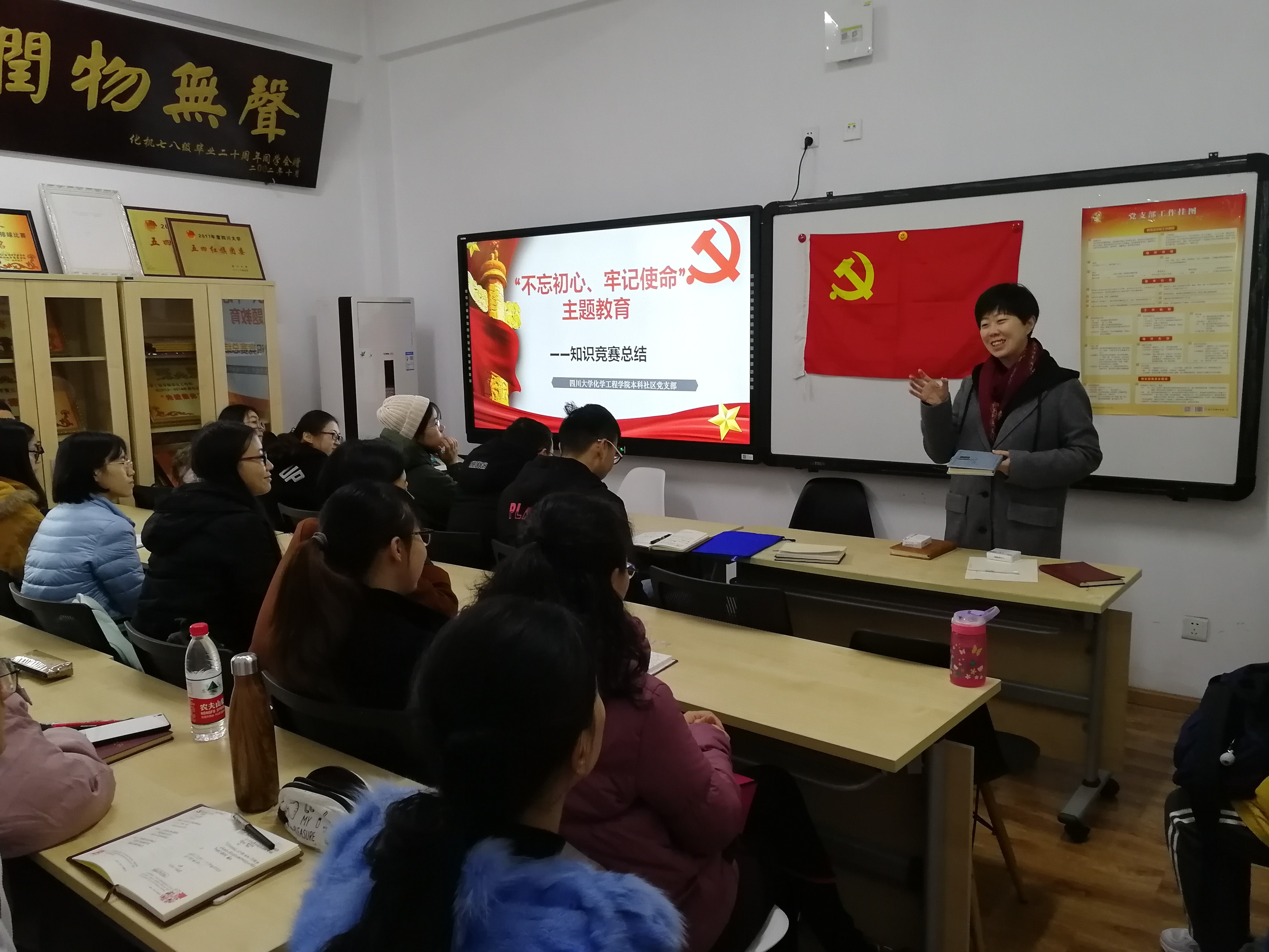 11月29日,化学工程学院本科社区党支部在江安校区三舍活动室举行庆祝“不忘初心 明确责任担当,牢记使命 争当优秀党员”的知识竞赛颁奖仪式。化学工程学院党委副书记姜利寒老师以及获奖支部代表、获奖个人参加了颁奖仪式,本次颁奖仪式由本科社区党支部书记李珍珍老师主持。