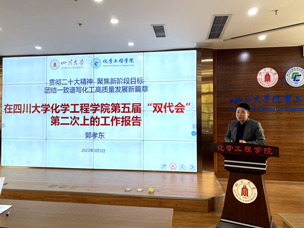 院长郭孝东同志作了《化工学院工作报告》《化工学院财经工作报告》。他说到,一年来,化学工程学院以习近平新时代中国特色社会主义思想为指导,深入贯彻党的二十大精神,胸怀“国之大者”、“校之大事”,强化党建与事业融合发展,聚焦培养一流人才、建设一流师资队伍和产出一流科研成果,推进了一流学院建设取得突出成绩、重要突破。他着重分析了学院发展存在的主要问题和短板,详细介绍了学院2023年度主要任务、重要指标和工作举措。他指出,全院师生要加快一流化工学院建设步伐,团结一致谱写学院高质量发展新篇章。