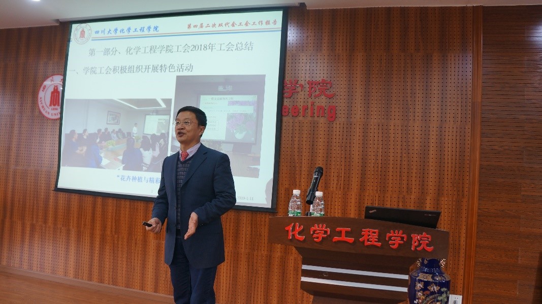 化学工程学院工会主席穆畅道同志代表学院第四届工会委员会向大会做工作报告。报告总结了学院工会一年来的工作情况,围绕中心、服务大局,充分发挥群众组织的优势,为全面深化改革建功立业。