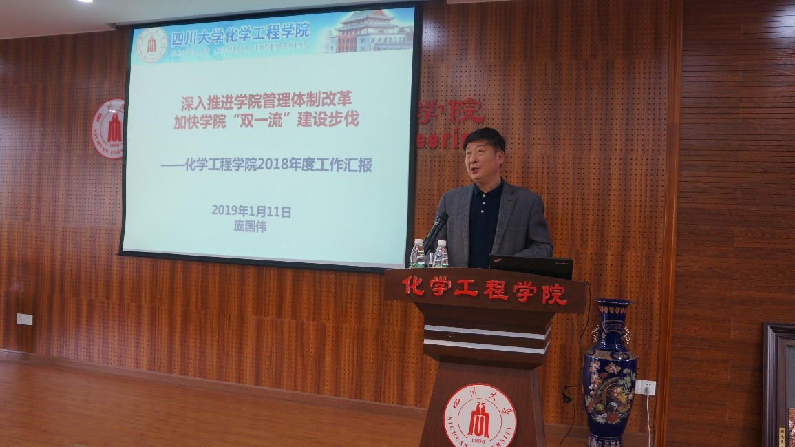 会议听取了学院党委书记庞国伟同志代表学院所做的《学院工作报告》和《财经工作报告》。庞书记在报告中全面回顾和总结了2018年全院工作。2018年是全面贯彻党的十九大精神的开局之年,是庆祝改革开放40周年,也是学院深化改革创新、加快推进“双一流”建设和校院两级管理体制改革的关键之年。学院全体师生深入学习贯彻习近平新时代中国特色社会主义思想和党的十九大精神,科学研究、人才培养、党建工作和队伍建设等方面都取得了显著成就:褚良银教授等获得2018年度国家技术发明奖二等奖;杰出教授钟本和先生获得“2018年度何梁何利奖”;学院获准国家重大项目2项,直接经费1800多万元。由钟本和教授带领团队入选全国首批“全国高校黄大年式教师团队”;梁斌教授获得国家级教学成果奖一等奖,宋航老师当选“四川省优秀教师”。同时,我们的党员师生充分发挥先锋模范作用,化学工程系党支部成功入选“全国党建样板支部”,研究生过程装备与安全科学党支部获得全国高校“百个研究生样板党支部”,党员罗杰同志获评“2017年度四川省优秀共青团员”和四川“勤学奋进新青年”。庞书记也代表学院对全院师生员工和离退休老同志在过去一年对于学院工作的帮助和支持表示感谢。随后,庞书记结合学校“两个伟大”的全面推进和校院两级管理体制改革,提出了2019年的工作展望,他希望全院师生共同努力,集中精力抓好一流拔尖人才、一流师资队伍、一流学科平台、一流成果转化机制、一流国际合作交流、一流环境条件建设,全力推进一流学科、一流专业建设,为早日建成一流化工学院而努力奋斗!