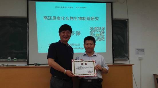 2015年7月9日上午,中国科学院大连化学物理研究所赵宗保研究员应邀走进我校“化工学术大讲堂”,在望江校区化工楼313会议室做题为“高还原度化合物生物制造的基础研究”的学术报告。来自化学工程学院、化学学院、高分子学院和生命科学学院等学院的老师和研究生数十名,聆听了赵宗保研究员带来的精彩报告。报告由化学工程学院党委书记庞国伟同志主持。
