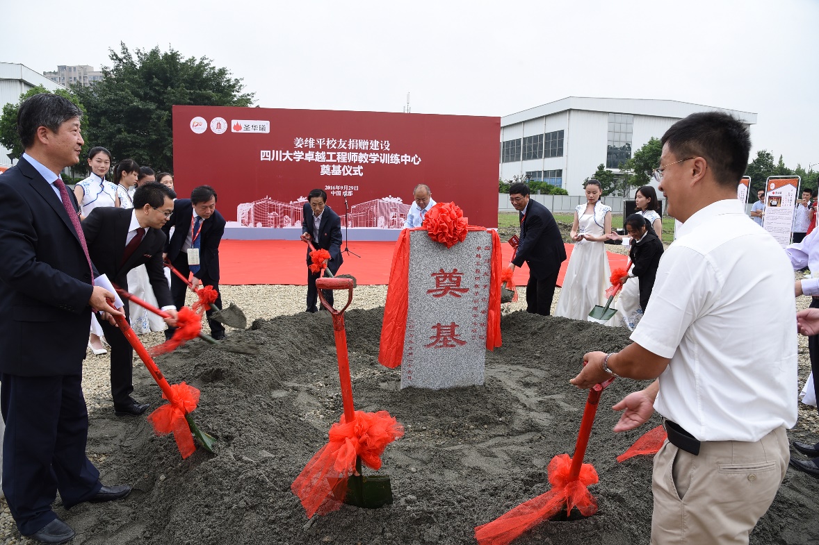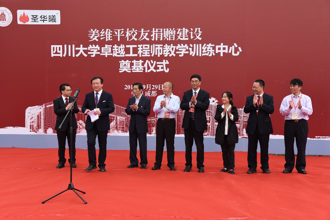 2016年9月29号上午11点,在全校师生喜迎四川大学120周年华诞之际,四川大学卓越工程师教学训练中心奠基仪式在江安校区环形大道北段、卓越工程师教学训练中心隆重举行。重庆圣华曦药业股份有限公司董事长姜维平及夫人李长渝女士、国家工商行政管理总局王江平副局长、四川大学党委副书记李向成教授、四川大学副校长许唯临教授、校长助理梁斌教授、规建处华国春处长、外联办荣建国主任、化学工程学院党委书记庞国伟、院长褚良银教授,部分师生及校友嘉宾等近300人共同见证了卓工大楼的奠基。奠基仪式由学院党委书记庞国伟主持。