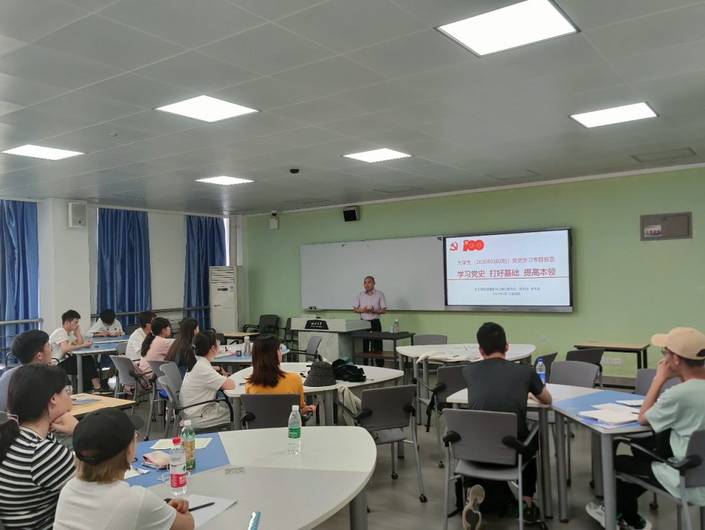 随后,李天友老师为大家带来了一堂题为《学习党史 打好基础 提高本领》的党史学习教育。李老师提到:今年是中国共产党成立的100周年,学校和学院正在开展党史学习教育活动,同学们要积极主动地深入学习党史,新中国史,改革开放史,社会主义发展史,认真领悟党的初心使命,努力学习奋发有为。会上,李老师详细介绍了中国共产党以及近代中国的发展历史:从鸦片战争,马格斯,恩格斯发表《共产党宣言》到辛亥革命,从中国共产党成立,南昌起义,红军长征,抗日战争,解放战争,再到改革开放和中国特色社会主义建设。同学们进一步了解了中国共产党百年奋斗的光辉历程和历史性贡献,增强了“四个自信”。