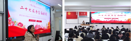 第二部分,李珍珍老师对二十大报告进行解读。李老师从“过去五年的工作和新时代十周年的伟大变革”“开辟马克思主义中国化时代化新境界”等四个方面对二十大报告进行解读,同时强调“走在前进的道路上,我们必须把握‘五项坚持’原则。”