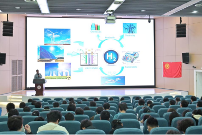 讲座伊始,康毅进老师围绕“电解水制氢及相关化工过程”,从技术原理、催化剂研发与产业应用三大维度展开讲解。在阐述核心研究与前沿实践时,他结合详实的实验数据与生动的微观结构图示,重点介绍了团队在非铱催化剂领域取得的重大突破,并分享了绿氢向绿氨转化的低碳工艺、电解水制氢与生物塑料制造耦合等前沿应用方向,使同学们对化工技术的产业赋能价值有了直观而深刻的认识。