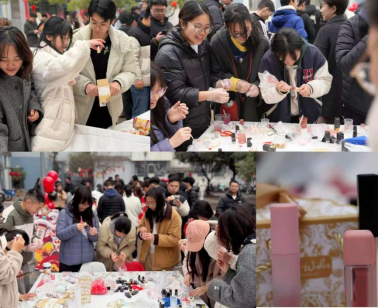 在趣味体验区,古方药妆体验倍受青睐。同学们利用天然植物油、乳化剂、香薰精油等原料,亲手制作唇釉和护手霜,在体验中感受古方与现代化工的完美结合。