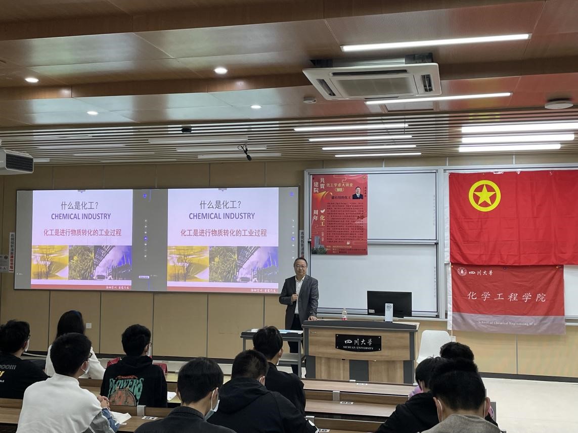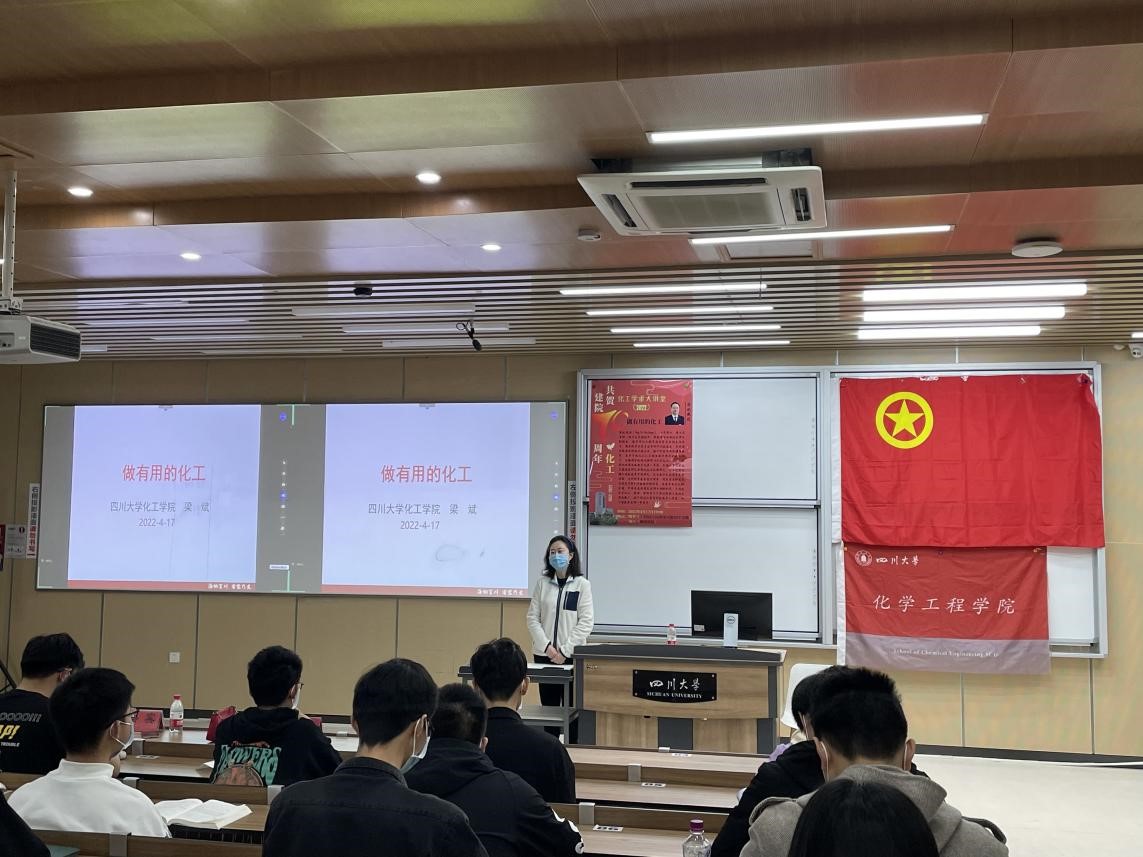 为了帮助化工学子对于化学工程、化学工业有更深入的了解,把握当代化工技术发展的现状和未来发展的趋势,鼓励同学们积极投身祖国化工事业的实践建设,四川大学化学工程学院于2022年4月17日晚上19:00在四川大学江安校区综合楼C座106教室成功举办了“共贺化学工程学院建院70周年”学术大讲堂。本期学术大讲堂由化工团委学生会学术科技部承办,为了做好疫情防控工作,采用线下交流和线上腾讯会议同步转播的形式。本期邀请到四川大学副校长梁斌教授带来了主题为“做有用的化工”的精彩讲座,同时化学工程学院副院长郭孝东、党委副书记姜利寒、2021级新生辅导员李珍珍也出席了活动,此外2021级本科生和部分高年级学生近400人(线上+线下)参与了本次讲座。