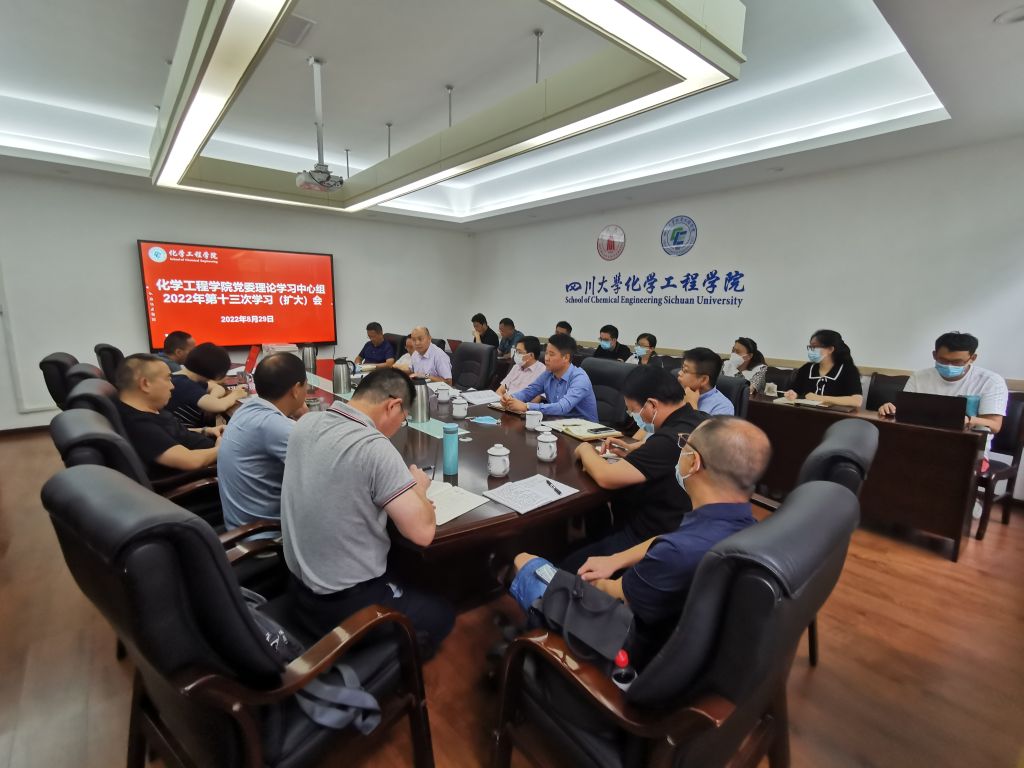 8月29日,化学工程学院在望江校区化工楼235会议室组织召开2022年第十三次党委理论学习中心组学习(扩大)会,深入学习贯彻习近平总书记在省部级主要领导干部专题研讨班上的重要讲话精神和毛主席经典著作《党委会的工作方法》。学院全体领导班子成员、党委委员、纪委委员、工会主席、专职组织员、系(基地、中心)主任、教工党支部书记、院长助理和科级干部等参加会议。会议由学院党委书记李天友主持。