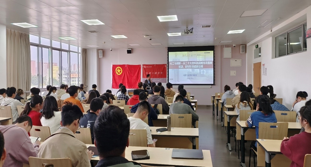 为增进化学工程学院2022级本科新生有关学院发展和学科前景的认识、增强学生的创新意识,2023年3月11日下午,四川大学化学工程学院郭孝东院长开展了题为《化工与创新--从二十大的科技战略布局看新能源、新材料的最新进展》的学术讲座。讲座会场选址在四川大学江安校区第一基础教学楼A406、A408、A410教室。化学工程学院党委副书记姜利寒、分团委书记李珍珍、辅导员李忆雯、袁玲、付率以及2022级本科生总计约300人参加了此次学术讲座。