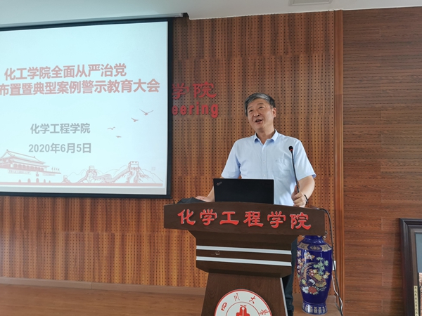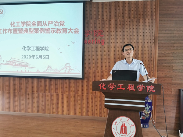 2020年6月5日下午,化学工程学院在望江校区正行楼(原西二教)召开全面从严治党工作布置暨典型案例警示教育大会。学院全体党政班子成员、工会主席和全体教职工等参加会议。会议由学院院长赵长生主持。