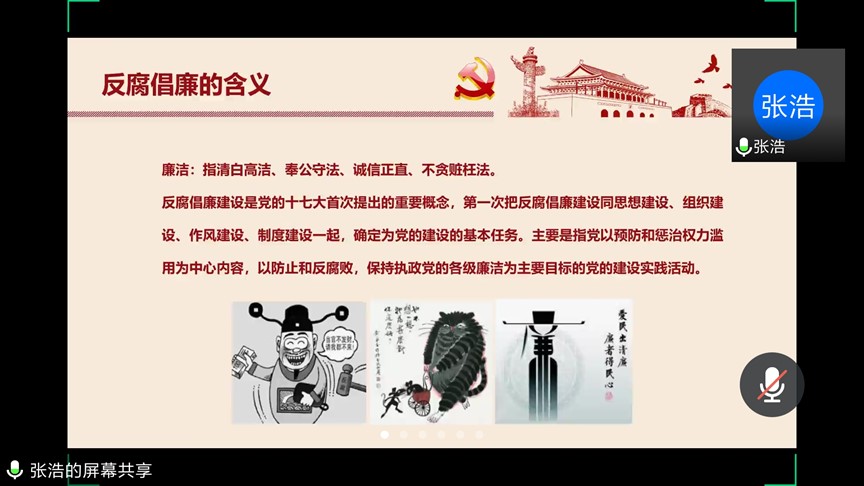 此次会议通过屏幕共享PPT和线上讨论的方式进行,丰富的讲解和讨论保证了主题党课活动的有效举行,推动支部工作高质量发展。筑牢思想防线,严守政治纪律。此次会议有利于支部抓好党风廉政建设和反腐败作风建设,营造风清气正的学习环境。在挫折中历练,在实干中成长,爱国主义教育让我们学习中华民族精神,更有信心挑战困难、创优争先。支部成员都一致表示会切实提高廉政意识,常怀纪律之心,将爱国主义转化为通过个人优秀能力回报党和国家的实际行动。