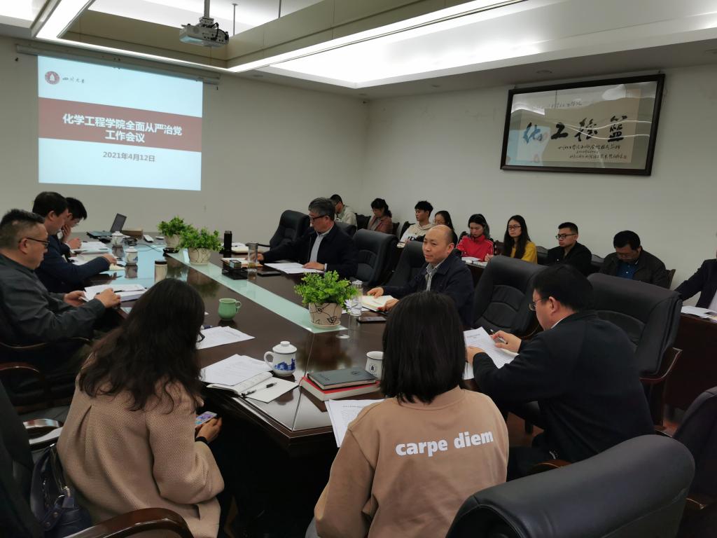 2021年4月12日下午,化学工程学院在望江校区化工楼235会议室组织召开2021年度全面从严治党工作会。学院全体班子成员、工会主席、专职组织员、纪委委员、各系级单位负责人、全体支部书记和科级干部参加会议。会议由学院党委副书记兼纪委书记李天友主持。
