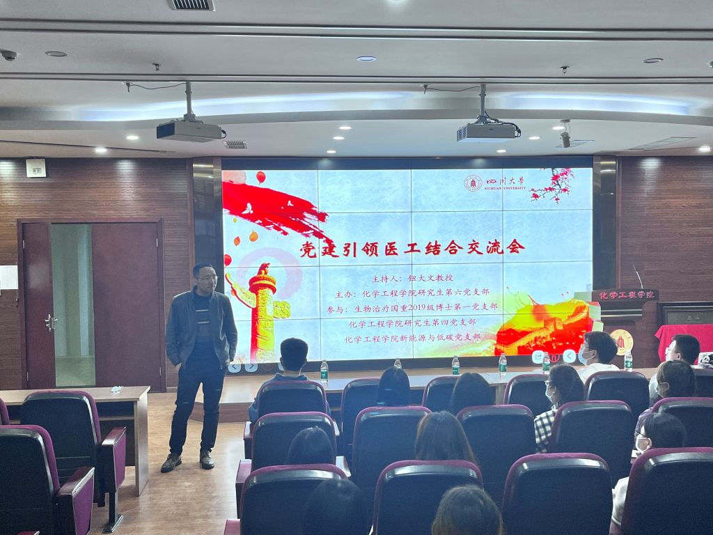 为进一步创新组织生活方式,推进基层党支部党建与事业融合发展,积极探索将支部组织生活与研究生教学科研活动有机结合,依托化工学院以及生物治疗国家重点实验室平台,学院研究生第六党支部、研究生第四党支部、研究生低碳党支部和生物治疗国家重点实验室2019级博士第一党支部于2022年4月21日在望江化工楼313会议室举办了“党建引领医工结合交流座谈会”主题党日活动。70余名硕博士党员参加此次活动。活动特别邀请了化工学院副院长钮大文教授主讲专题党课并进行交流分享。