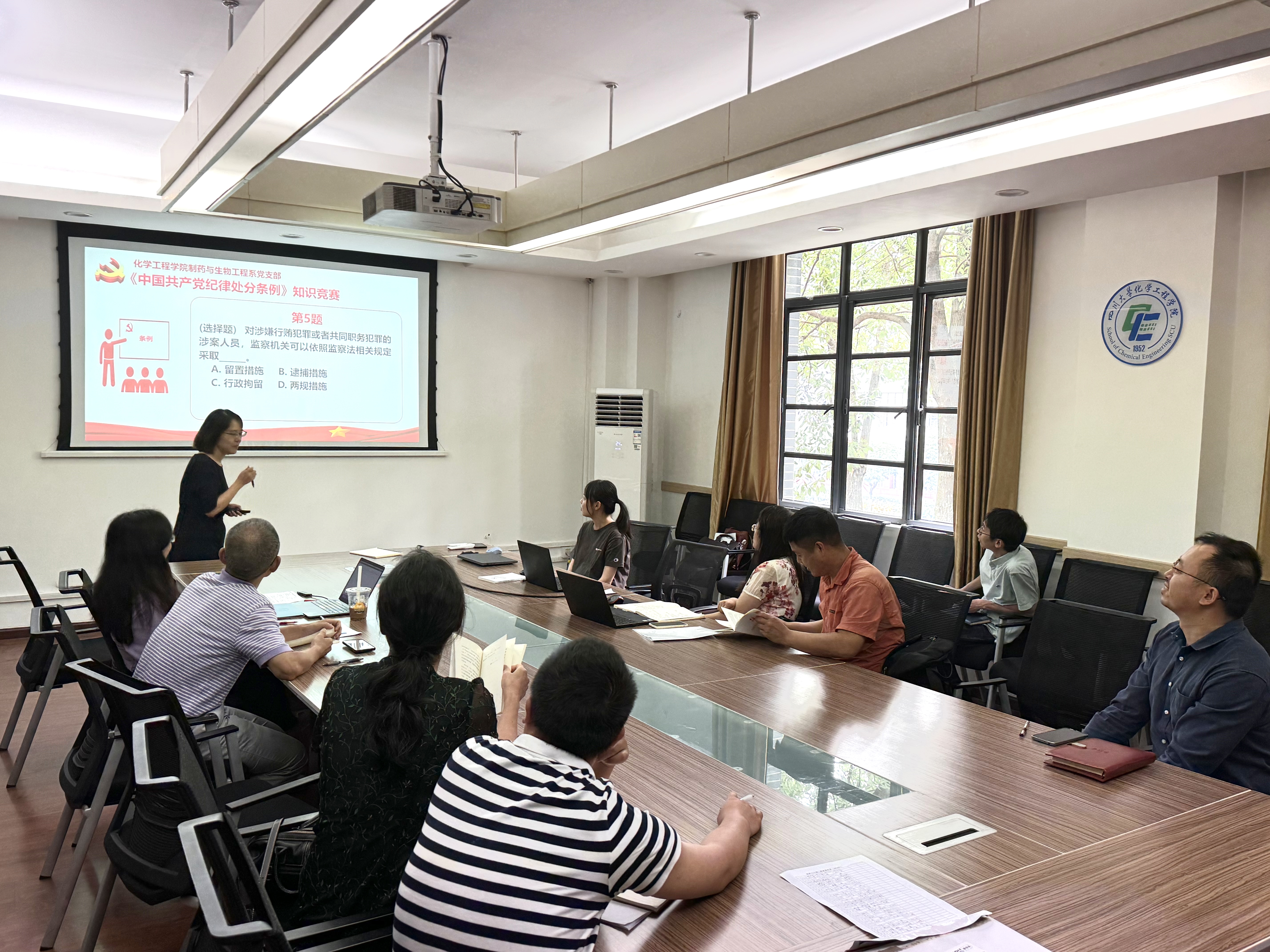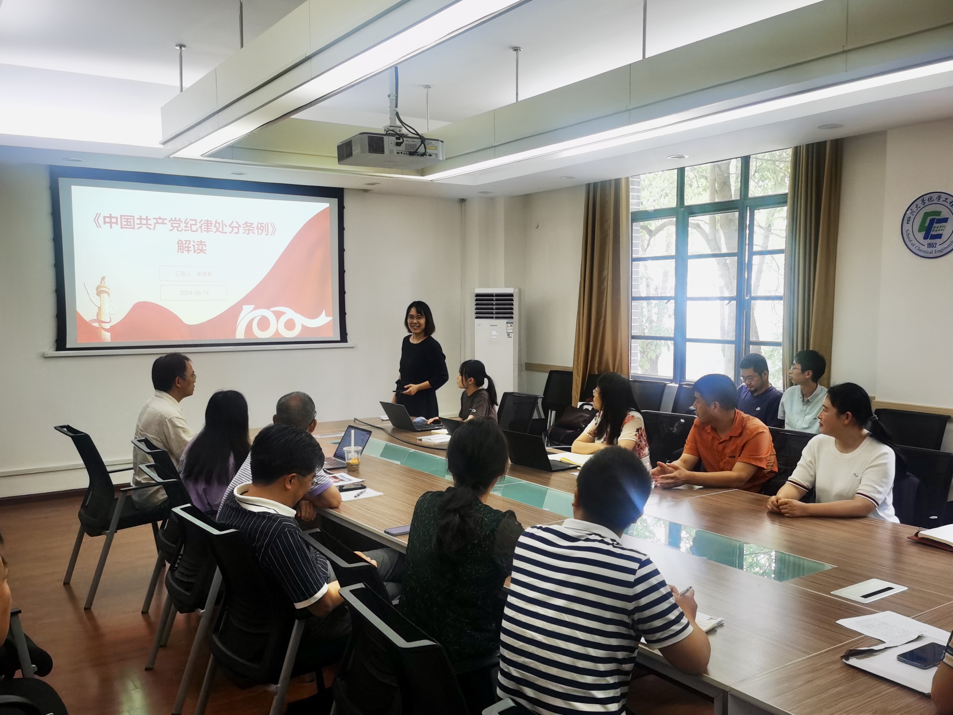 2024年6月14日上午,化学工程学院制药与生物工程系党支部在望江校区化工学院227会议室组织开展了《中国共产党纪律处分条例》学习暨知识竞赛主题党日活动,本次会议由党支部书记谢通慧同志主持。