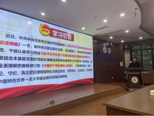 会议过程中,由党支部副书记夏有强同志作为主讲人,对《习近平关于全面加强党的纪律建设论述摘编》进行解读。夏有强同志以《摘编》中七个精彩篇章为出发点,深刻而具体地阐述了严明党纪的首要任务是严明政治纪律,从党员领导干部到各自组织要落实管党治党责任,强化监督执纪问责,结合近期“涉嫌受贿”“污蔑偷拍”等的违反党纪的典型案例,引导支部党员进一步强化纪律意识。