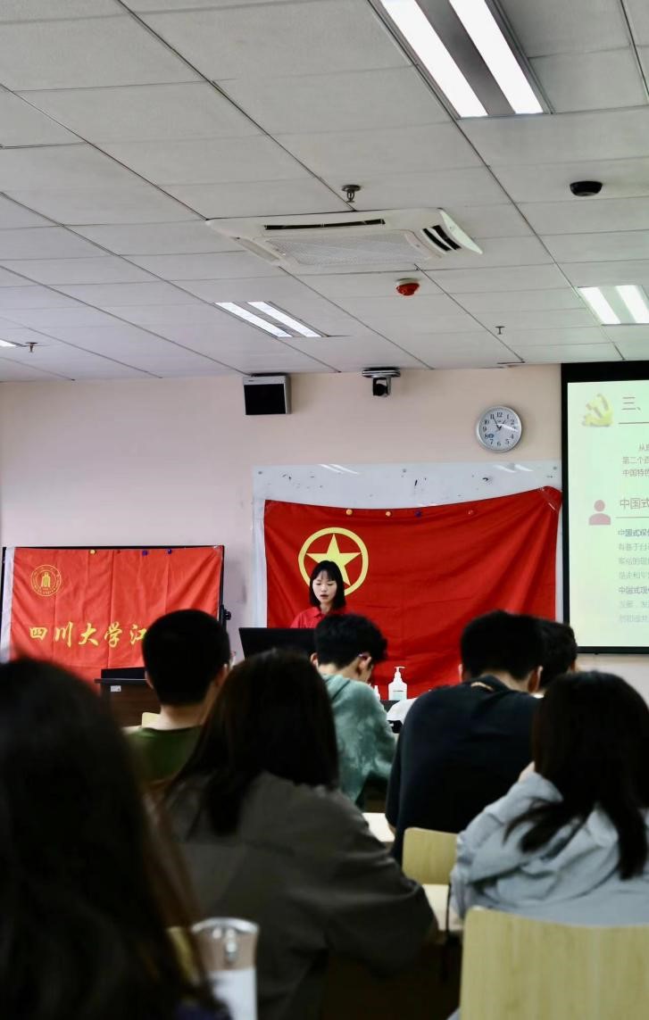 四川大学青马工程“弘毅班”第十五期学员、历史文化学院2020级旅游管理专业刘静秋同学作为领学人,带领青年团员学习“党的二十大报告”“党的二十大精神”“做新时代好青年”,将习近平新时代中国特色社会主义思想、党的二十大精神引向深入。领学人刘静秋同学在讲授中说道:“全面领会党的二十大精神,准确把握报告的丰富内涵至关重要。实现中国梦需要我们一代代青年追梦人接续奋斗。作为新时代青年团员,我们应该肩负民族复兴的大业,要将个人梦想与中国梦紧密结合。”