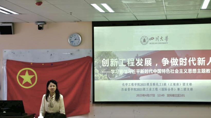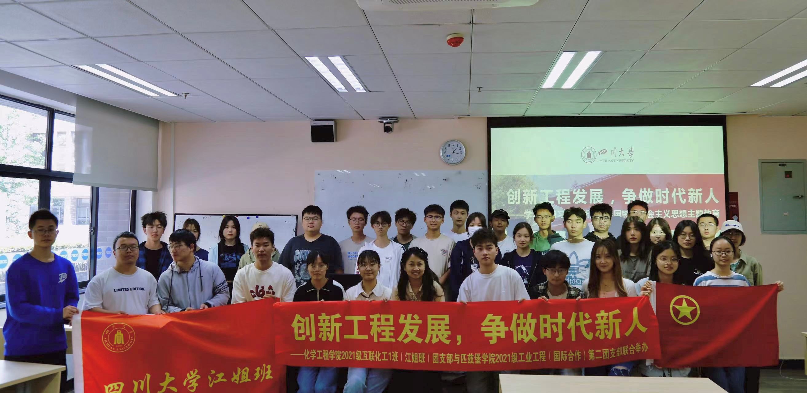 为进一步学习贯彻习近平新时代中国特色社会主义思想,学懂弄通做实党的二十大精神,引导青年团员不断增进对党的创新理论的认识,并引领青年将个人成长与时代发展融为一体。2023年4月27日,化学工程学院互联化工1班团支部与匹兹堡学院2021级工业工程(国际合作)第二团支部四月联合主题团日活动于文科楼三区101顺利举办,结合专业特色开展习近平新时代中国特色社会主义思想主题教育学习会。与会人员有化学工程学院团委书记李珍珍老师和两团支部全体成员。