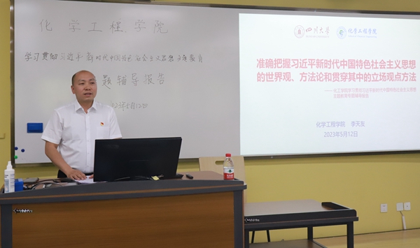 为深入学习贯彻党的二十大精神,扎实开展习近平新时代中国特色社会主义思想主题教育,牢牢把握习近平新时代中国特色社会主义思想的世界观和方法论,不断增进广大党员对党的创新理论的政治认同,5月12日下午,化学工程学院在研究院3-119召开学习贯彻习近平新时代中国特色社会主义思想主题教育辅导报告暨专题党课,学院党委书记李天友主讲,学院教工党员、离退休和学生党员代表等100余人参加会议。