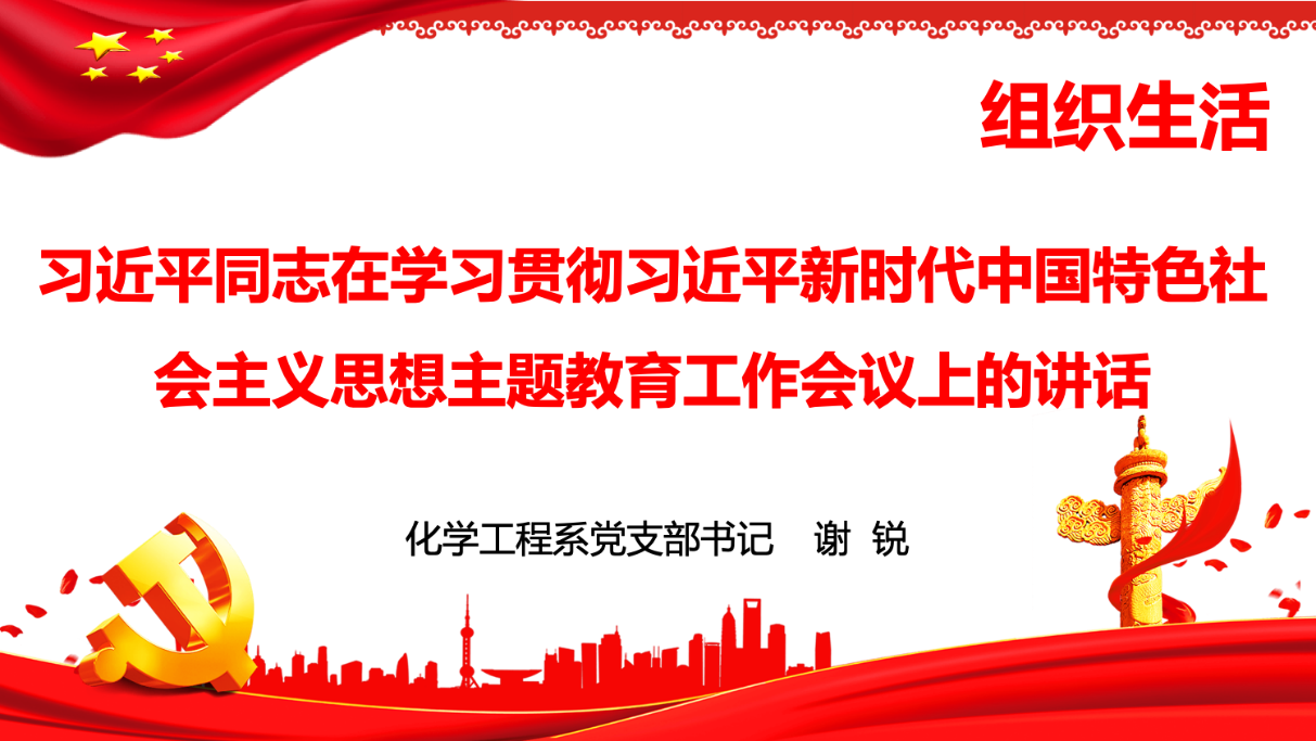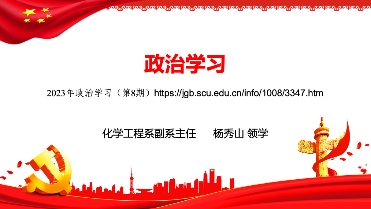 2023年5月26日下午14时,四川大学化学工程系线上开展了2023年度第8期政治学习和党员组织生活。政治学习由化学工程系党支部书记谢锐同志主持,化工系副主任杨秀山同志领学。谢锐同志主讲《习近平同志“在学习贯彻习近平新时代中国特色社会主义思想主题教育工作会议上的讲话”》的主题教育微党课。
