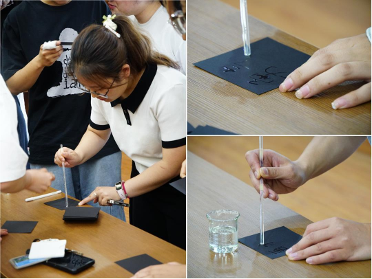 明担当。化学工程学院研究生辅导员邓磊以盐水为喻,带领同学们在黑色卡纸上书写新时代担当承诺,让学生将责任与使命铭记于心。