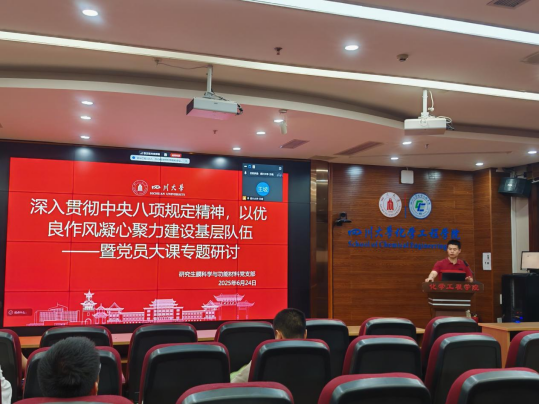 为深入贯彻落实中央八项规定精神,强化纪律意识、深化作风建设,研究生膜科学与功能材料党支部于2025年6月24日晚在望江化工楼313室开展“深入贯彻中央八项规定精神,以优良作风凝心聚力干事创业”的专题党课学习及党政大课交流研讨会。