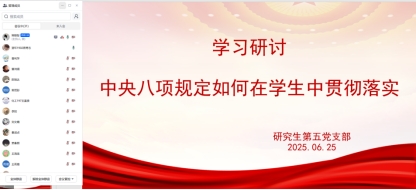 2025年6月25日,研究生第五党支部线上召开会议,围绕学习中央八项规定及发展王海龙为预备党员两大议题展开。