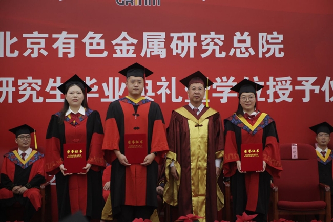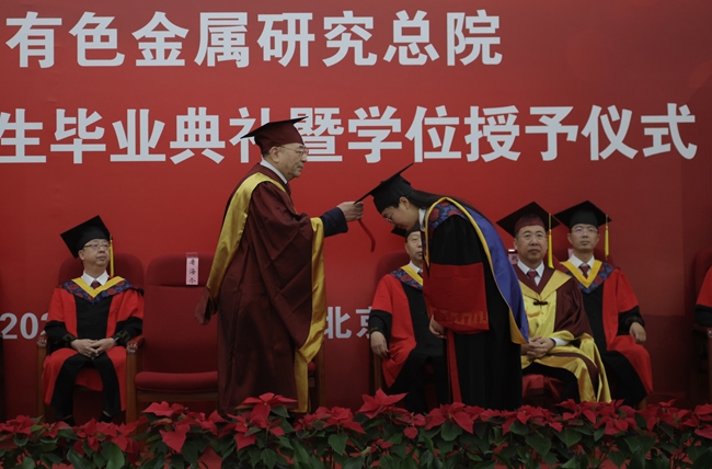毕业典礼在国歌声中拉开帷幕。李志辉首先宣读了授予赵艳芸等24名学生博士学位、成想等41名学生硕士学位的决定。有研总院名誉院长、学位评定委员会名誉主席屠海令院士,有研总院学位评定委员会常务副主席黄小卫院士为毕业生拨穗并颁发学位证书。有研总院院长、学位评定委员会主席赵晓晨为获优秀学位论文的学生及其导师、获院长奖学金的学生颁奖。