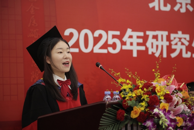 博士毕业生、一等院长奖学金获得者赵艳芸代表全体毕业生对总院领导和老师的悉心栽培表达诚挚的感谢。她分享了对有研精神的感悟,表示在未来的道路上,将潜心追寻生命意义、千锤百炼专业本领,做好“新时代有研青年”。