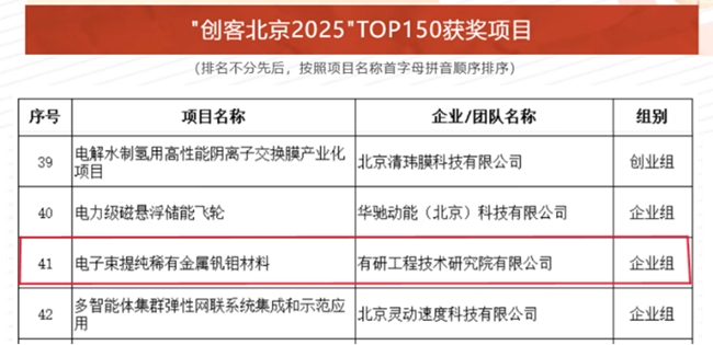 近日,在第十届“创客中国”北京市中小企业创新创业大赛暨“创客北京2025”创新创业大赛中,有研工研院特种加工技术与装备事业部研发团队申报的“电子束提纯稀有金属钒钼材料”项目,历经初赛、复赛、决赛多轮激烈角逐,从全市6098个参赛项目中脱颖而出,成功跻身大赛TOP150榜单。