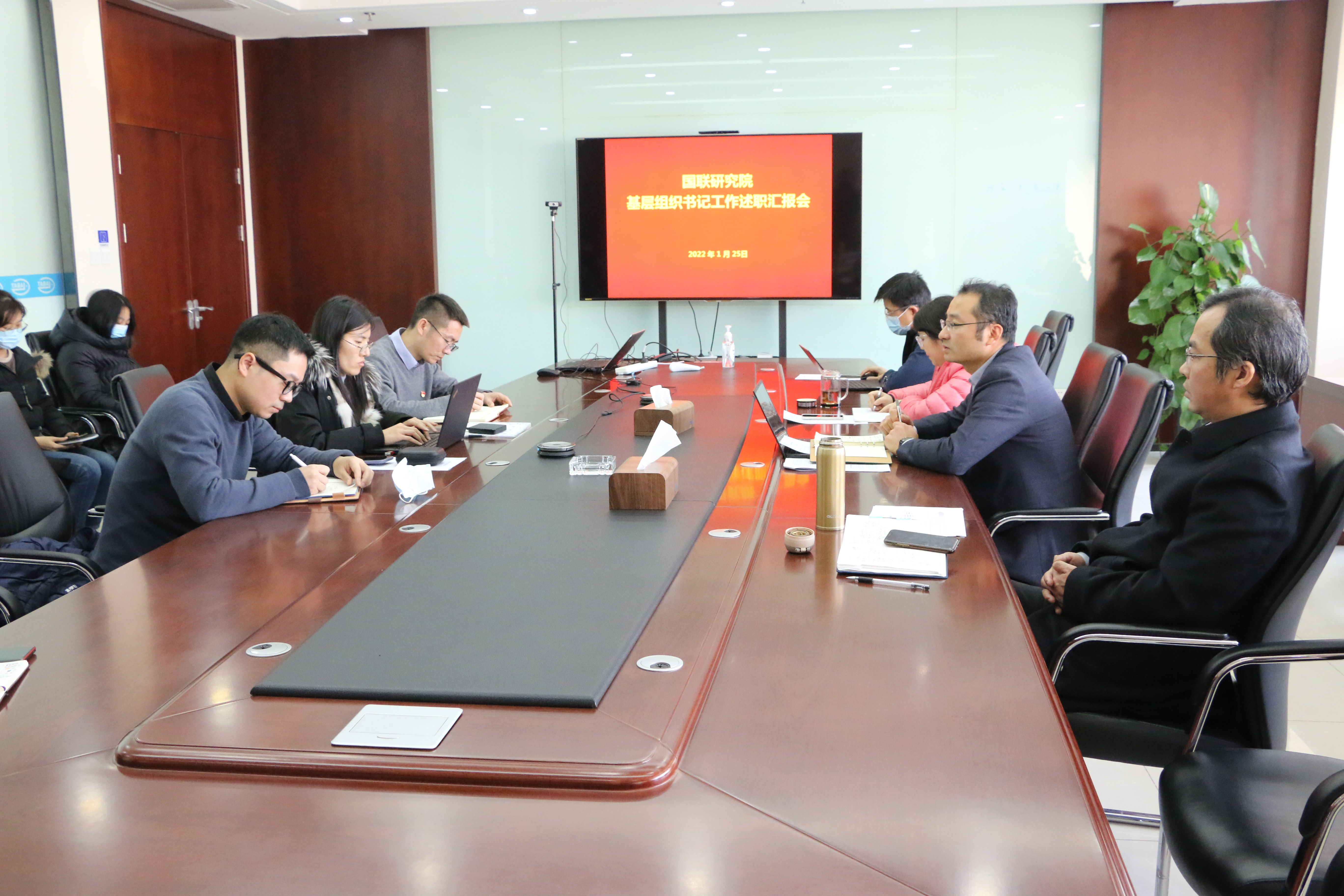 国联研究院第一党支部、第二党支部书记进行党建工作现场述职,分别从深入学习习近平新时代中国特色社会主义思想情况、持续巩固扩大国企党建工作会精神贯彻落实成果情况、全面学习贯彻党的十九届六中全会精神情况、在中心任务中发挥党支部和党员作用情况及履行第一责任人职责情况等方面总结2021年度党建工作,认真查找存在问题,研提2022年工作计划。