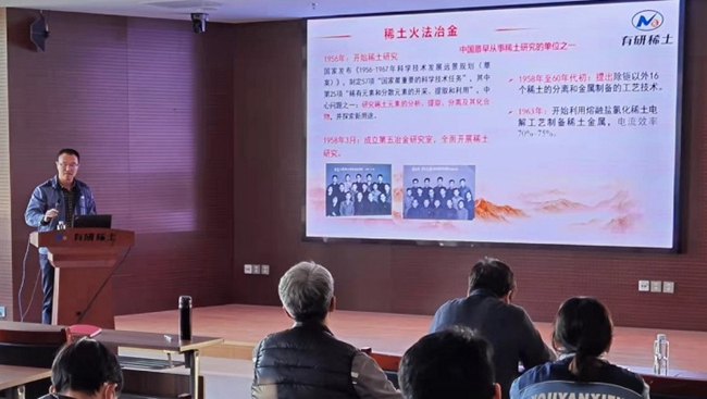 11月24日,有研稀土党总支举办“学党史·学稀土发展史”系列讲座第三讲,公司副总经理、中国稀土学会火法冶金委员会主任王志强做了题为“稀土火法冶金”的专题报告。报告以时间为轴,详细讲述了稀土火法冶金的发展历史,涵盖了电解法制备稀土金属、还原法制备稀土金属、中重稀土金属的发展、轻稀土金属的发展和高纯稀土及靶材等内容,讲述了有研稀土火法冶金工艺技术不断发展的历程。王志强通过回忆有研稀土金属事业部、乐山有研公司火法冶金事业发展的艰辛历程,表达对前辈们的敬意,并激励大家发扬继承优良传统,努力将火法冶金工作不断推向前进。